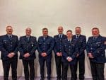 Die gewählten Kommandomitglieder mit Stellv. Ortsbrandmeister Uwe Schütte (links) und Ortsbrandmeister Michael Warner (rechts)