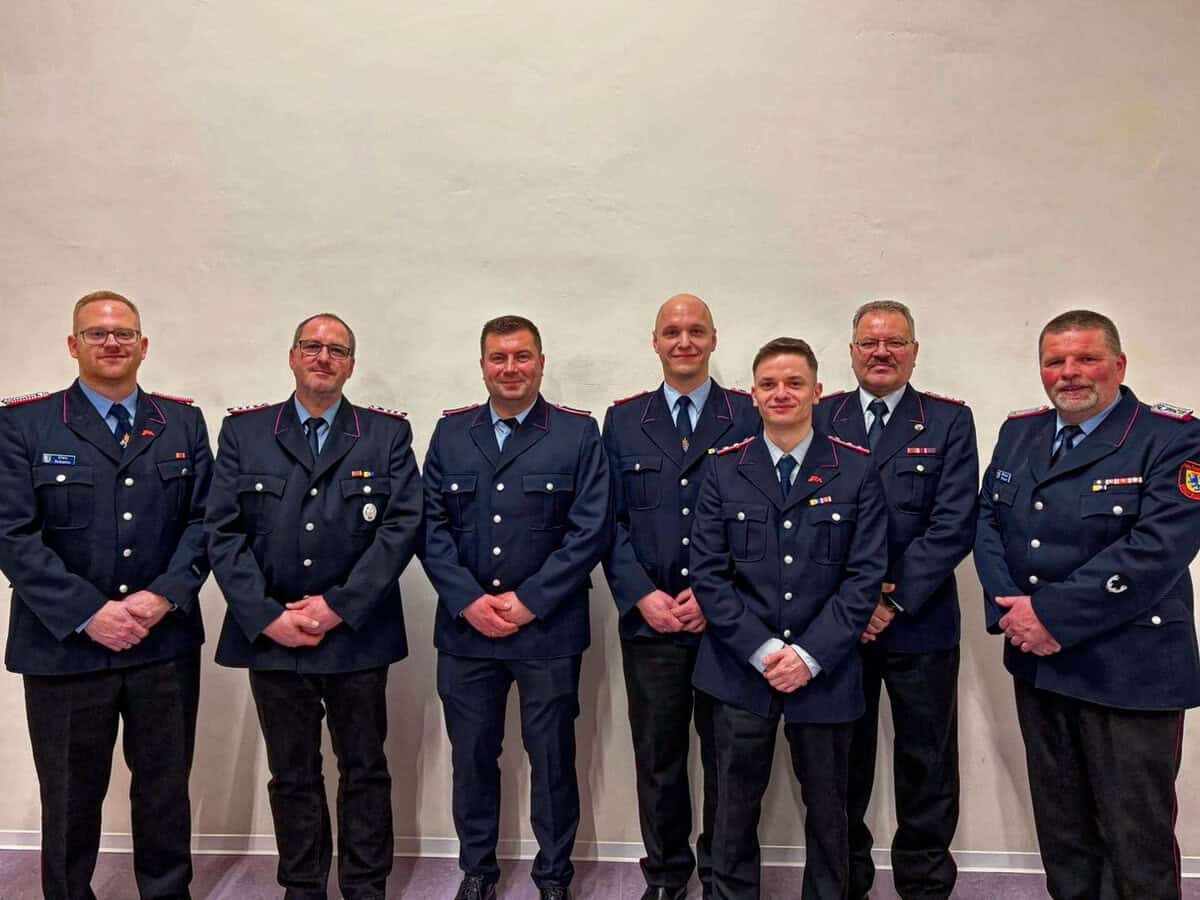 Die Beförderungen auf der Jahreshauptversammlung 2026 – rechts Ortsbrandmeister Michael Warner