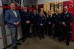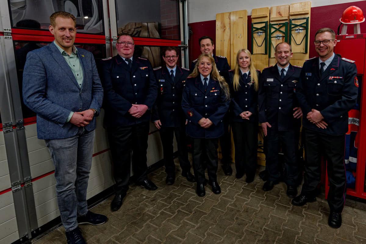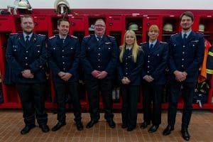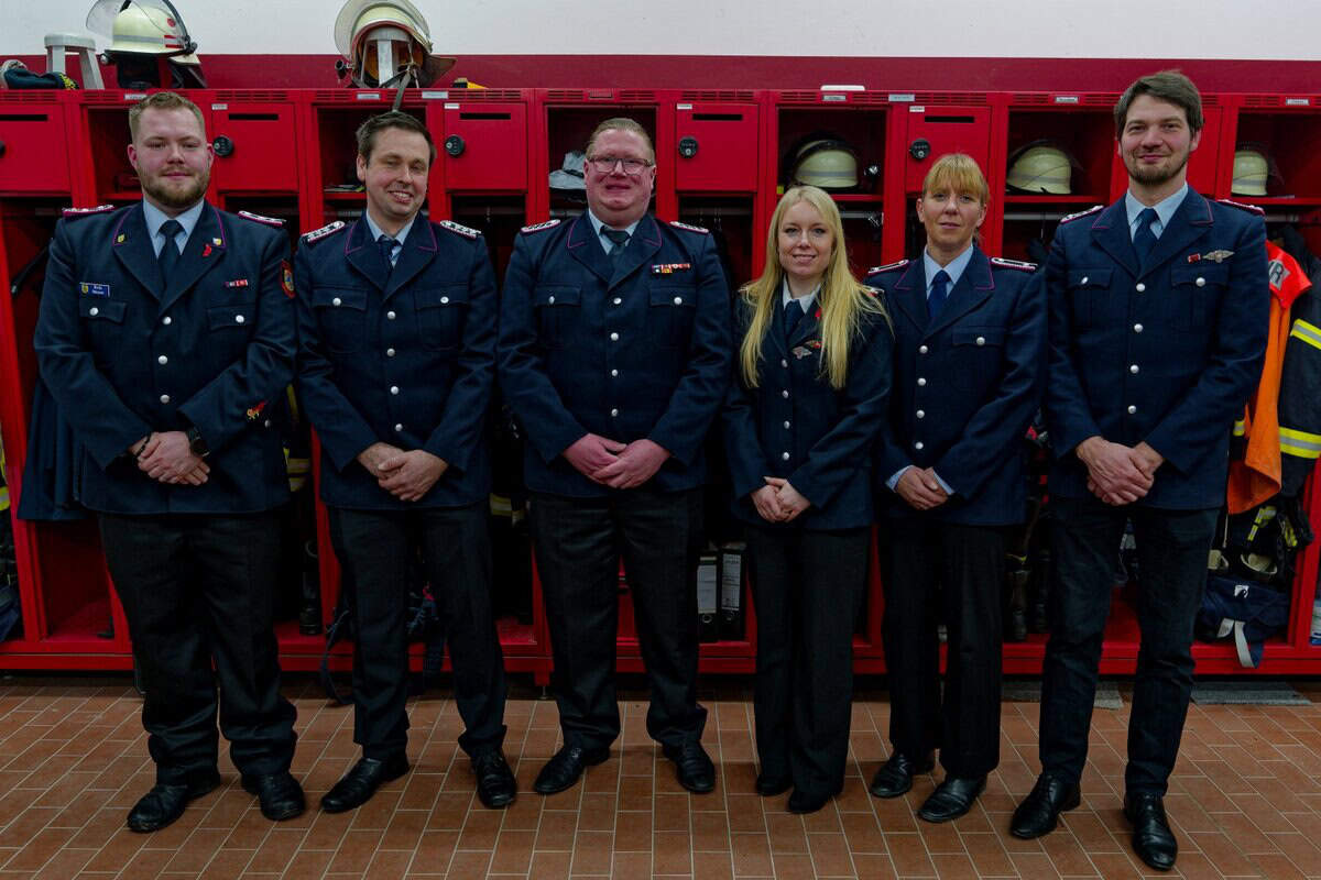 Foto, von links: Bürgermeister Dennis Neumann, der neue Stadtjugendfeuerwehrwart Steffen Ramm, Leon Haemmerich, Susanne Kluge, Jan-Marcel Deeke, Svenja Meyer, Kreisjugendfeuerwehrwart Sascha Voigt und Stadtbrandmeister Falk Bardenhagen.