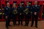 Verabschiedung, von links: Kreisjugendfeuerwehrwart Sascha Voigt, Susanne Kluge, Leon Haemmerich, Barbara Foelske und Stadtbrandmeister Falk Bardenhagen.