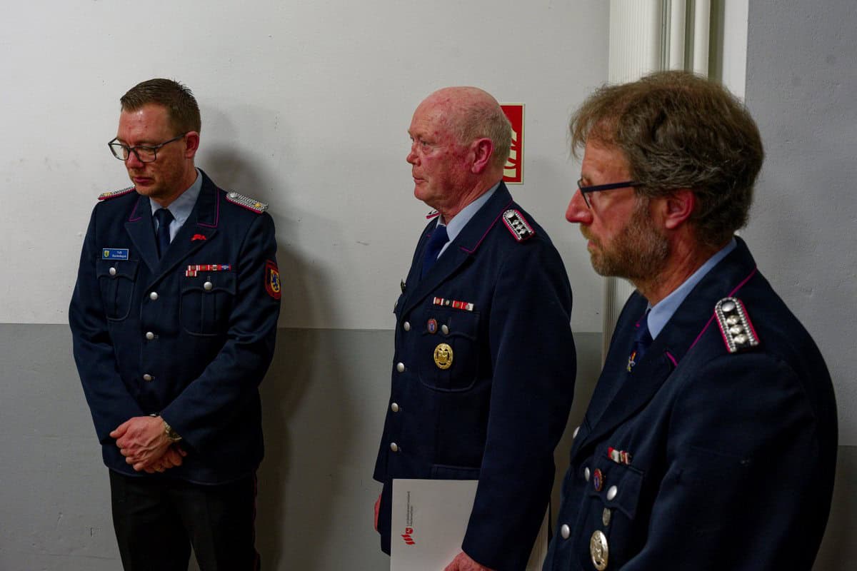 Ehrungen, von links: Stadtbrandmeister Falk Bardenhagen mit Manfred Evers und Norbert Schulz.