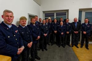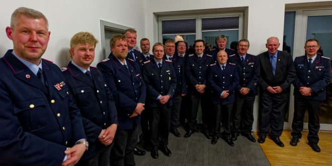 Foto, von links: Stellv. Kreisbrandmeister Stephan Dick, Jannik Kastens, Marco Heinemann, Carsten Gieseler, Carsten Banse, Thorsten Meyer, Marcus Twesten, Steffen Ramm, Jan-Marcel Deeke, André Clement, Ralf Bullmann, Rainer Kastens, Stellv. Bürgermeister Herbert Beusch und Stadtbrandmeister Falk Bardenhagen.