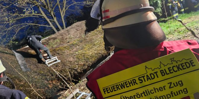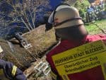 Eine Kernaufgabe war die Brandbekämpfung bei Reetdächern. Hier zeigten zwei Reetdachdecker den Einsatzkräften den Aufbau der Dächer und die Möglichkeiten für die Feuerwehr diese für die Löscharbeiten zu öffnen.