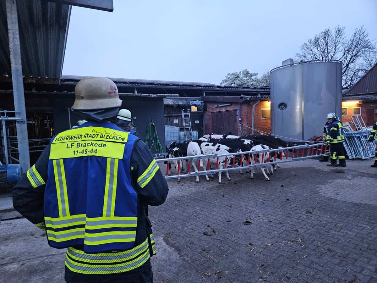 Löschwasserförderung aus drei Wasserentnahmestellen, mehrere Trupps unter Atemschutz zur Brandbekämpfung und die Evakuierung von 20 Kälbern aus einem Stall.