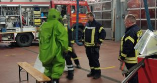 Stationsausbildung im Feuerwehrhaus: Chemikalienschutzanzug (CSA), Kommunikation und Dekontamination. Das richtige Programm zum Bergfest ;-)